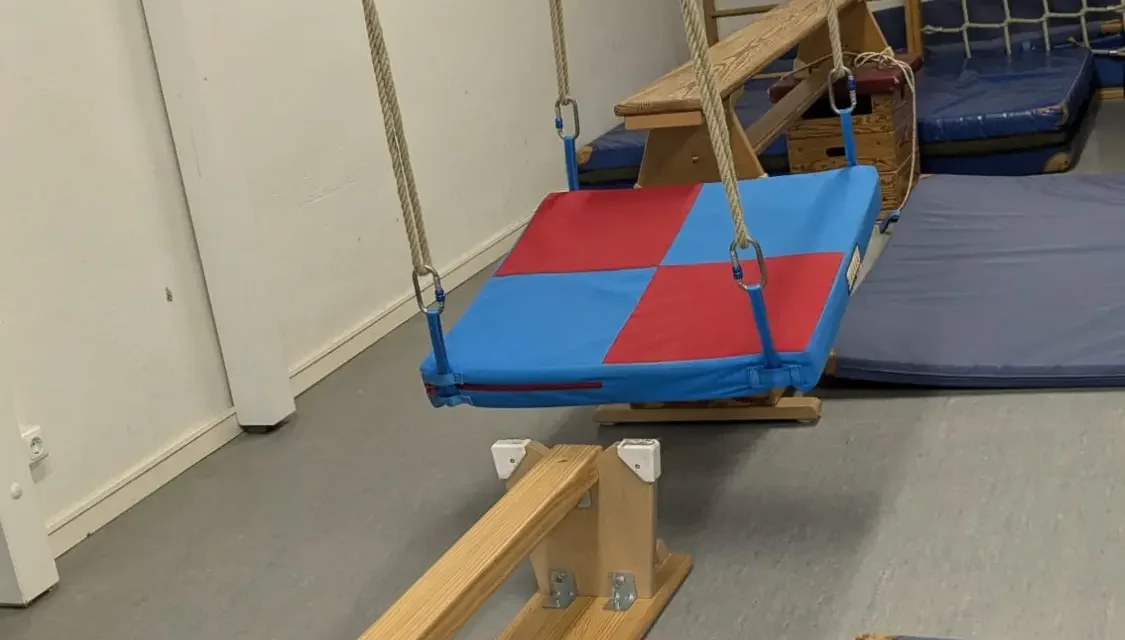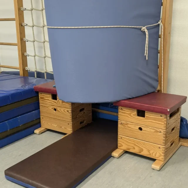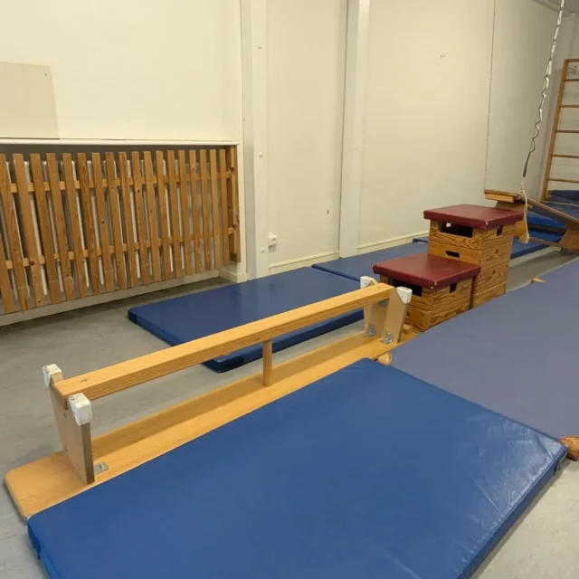 Unsere Turnhalle ist für die Kinder über den Innenhof selbstständig zu erreichen. Hier erwartet sie eine Vielzahl an Bewegungsmöglichkeiten, die ihre motorischen Fähigkeiten fördern und den Spaß an der Bewegung wecken. Die Sprossenwand lädt zum Klettern und Turnen ein, während verschiedene Schaukelmöglichkeiten für aufregende Schwungmomente sorgen. Außerdem stehen viele Kleinmaterialien zur täglichen Bewegung zur Verfügung. Die Turnhalle bietet den Kindern einen Raum, in dem sie sich austoben, neue Bewegungen ausprobieren und ihre Geschicklichkeit spielerisch entwickeln können.